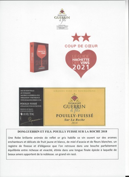 Notre Pouilly Fuissé Sur la Roche 2018 obtient le coup de cœur du jury pour l'édition 2021du Guide Hachette.