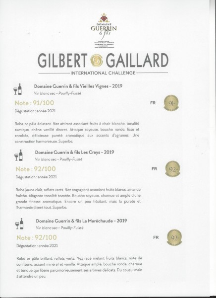 Médaille d'or pour les trois Pouilly Fuissé présenté chez Gilbert et Gaillard